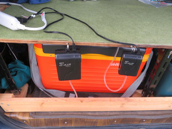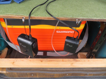 今年、おとり缶に100V仕様のエアーポンプをもう1台増やして2台で動作させています。車中泊中エアーポンプを作動させ、おとり鮎を生かしていますが、2台になった分少しうるさく感じました。