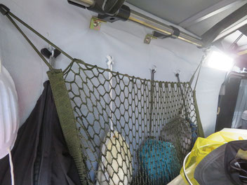 荷物を置く場所にネットを張って物を置いているのですが、置く荷物が多くなり重ねておいても崩れてきて下側が膨れた状態になるのでフックを取り付け軽い物をぶら下げるようにしました。